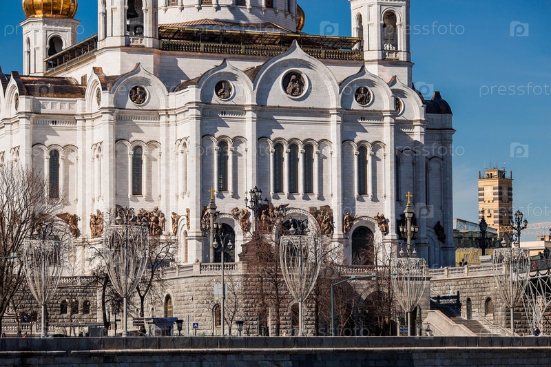 Русский православный собор - собор Христа Спасителя в Москве на фоне голубого неба в солнечный весенний день. Российская Федерация, Москва