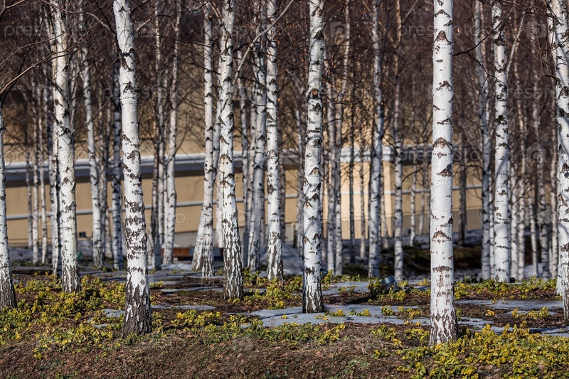 Фон стволов березы, текстура дерева. Березовая роща ранней весной в Москве у храма Христа Спасителя
