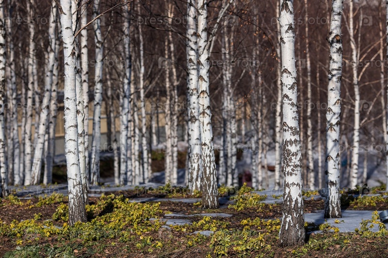 Фон стволов березы, текстура дерева. Березовая роща ранней весной в Москве у храма Христа Спасителя