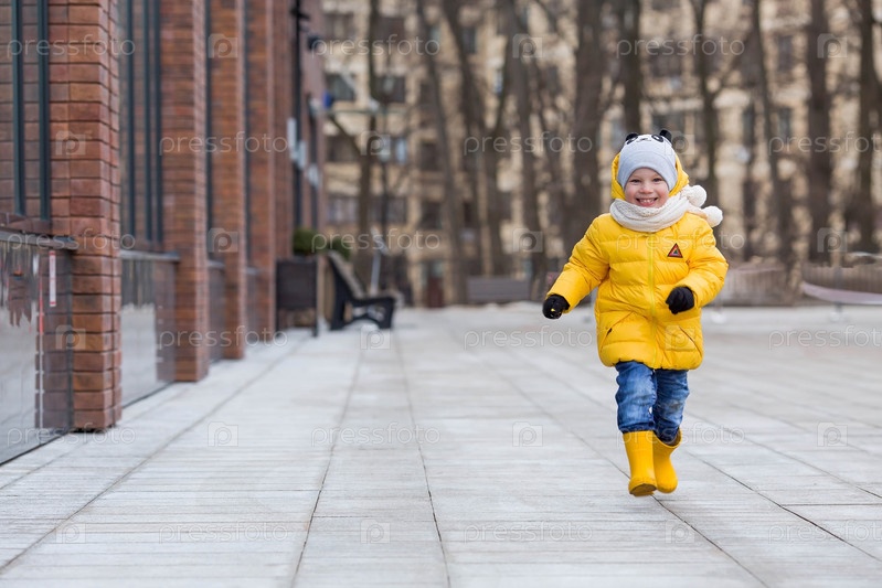 Портрет маленького ребенка 4 лет в желтых резиновых сапогах и куртке. Малыш гуляет в парке весной. Фото весенних и осенних праздников