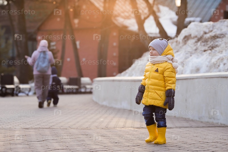 Портрет маленького ребенка 4 лет в желтых резиновых сапогах и куртке. Малыш гуляет в парке весной. Фото весенних и осенних праздников