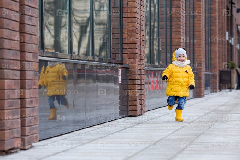 Портрет маленького ребенка 4 лет в желтых резиновых сапогах и куртке. Малыш гуляет в парке весной. Фото весенних и осенних праздников