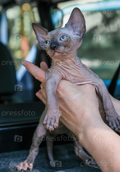 Двухмесячный котенок сфинкс на задних лапках