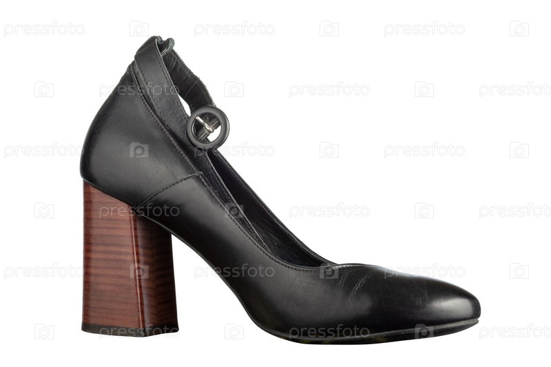 Черная кожа высокие коричневые каблуки женская обувь, изолированные на белом фоне. Женская обувь с закрытым носком