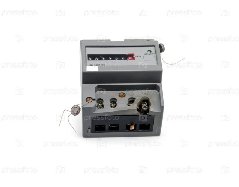 Поврежден счетчик электроэнергии. Расплавленный терминал. Крупный план. Изолированные на белом фоне
