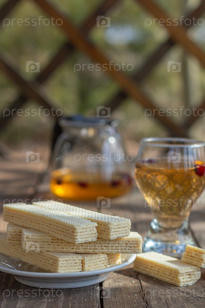 Чаепитие со сладкими русскими вафлями на деревянном фоне. Традиционные сладости и десерт