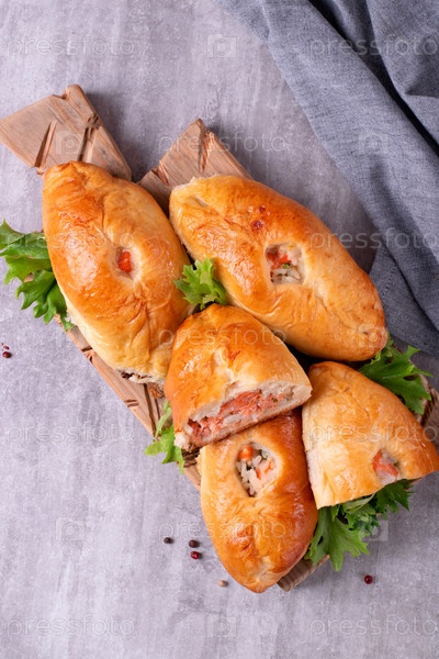Расстегайские булочки с красной рыбой, рисом и жареным луком. Хлебобулочное изделие из дрожжевого теста. Вид сверху