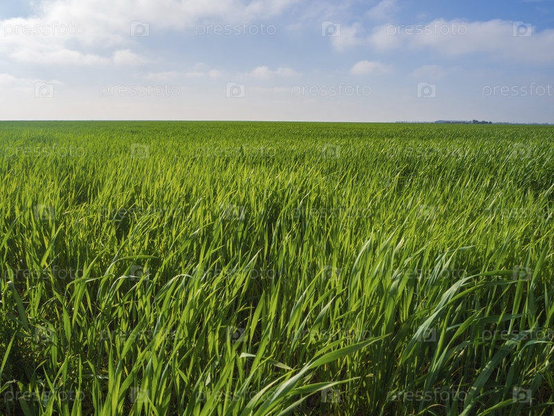 Зеленая трава в поле с голубым облачным небом. Сельскохозяйственное поле, где растут молодые зеленые ростки озимой пшеницы, летний или весенний пейзаж с голубым небом в солнечную погоду