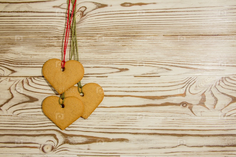 Печенье ручной работы в форме сердца, привязанное к веревке на деревянном фоне на День святого Валентина, Рождество или любой праздник любящих людей