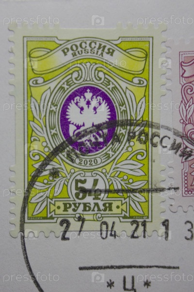 Санкт-Петербург, Россия 2020 г. Марка, выпущенная в Российской Федерации, с изображением Герба России, около 2020 г. (стоимость 54 рубля (на русском языке)), и печать почты России (на русском языке)