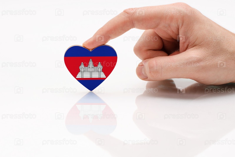 Флаг Камбоджи. Любите и уважайте Камбоджу. Мужская рука держит сердце в форме флага Камбоджи на поверхности белого стекла. Концепция патриотизма и туризма
