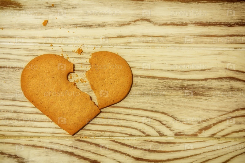 Имбирное печенье и крошки в форме разбитого сердца на деревянном фоне, концепция любви
