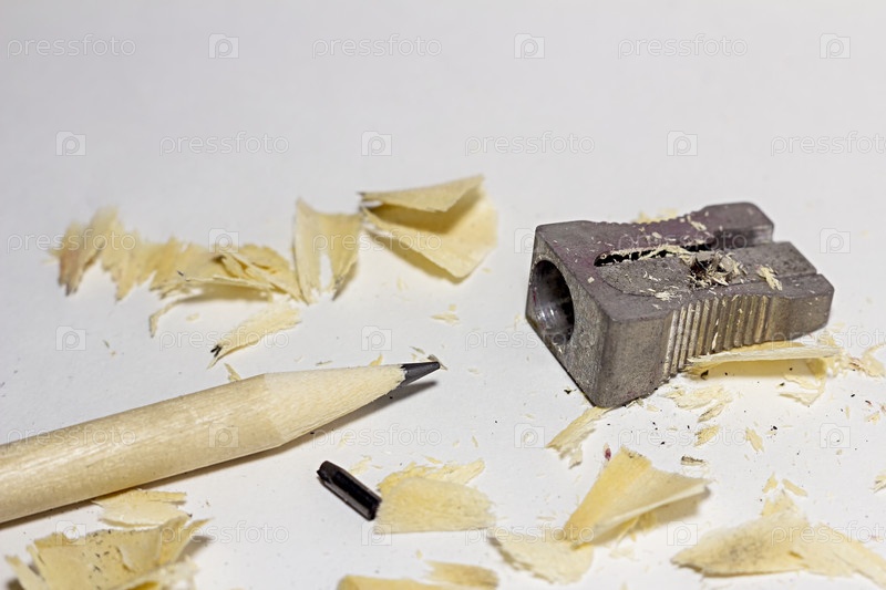 Сломанный карандаш с металлической точилкой, сломанный свинцовый стержень и стружка на фоне белой бумаги