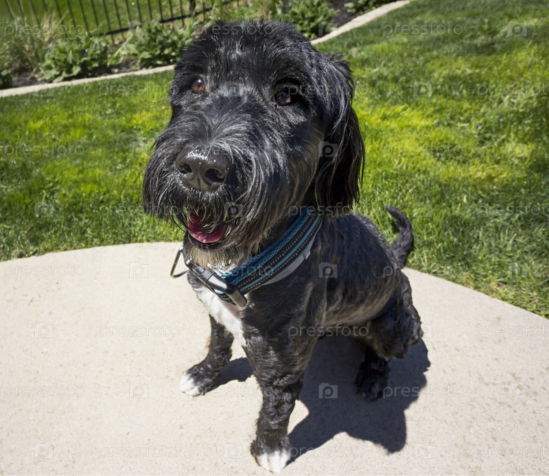 Португальская водяная собака сидит на заднем дворе, фото с широкоугольным объективом