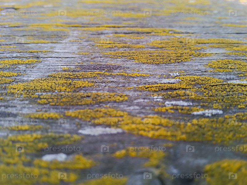 Золотисто-желтый щит Лишайник крупным планом на поверхности старых деревянных досок, фон