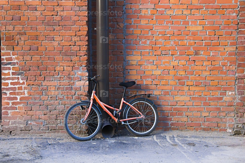 Один припаркованный велосипед на фоне старой кирпичной стены, прикрепленной к водоводу (трубе) в городе