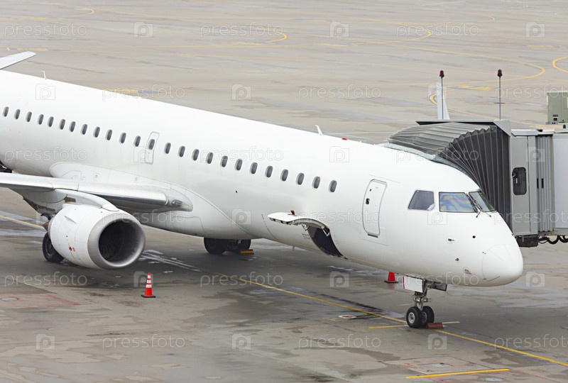 Самолет припаркован в аэропорту для подготовки к полету и загрузки груза и багажа
