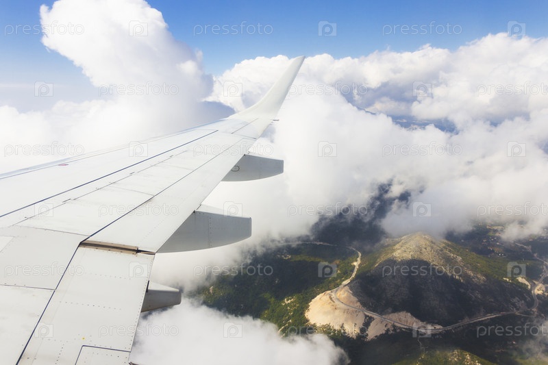 Крыло самолета, летящего над облаками, побережьем и горами Черногории, Европы