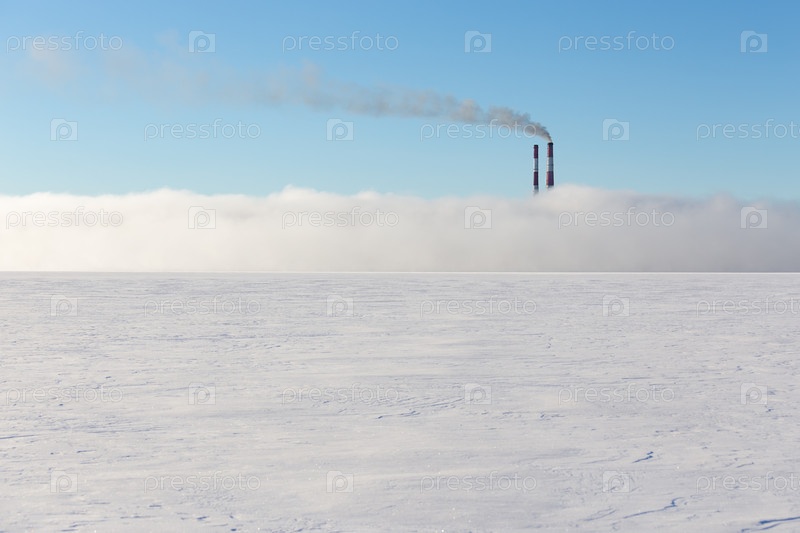 Дымовые трубы в тумане на замерзшем озере. Загрязнение. Вредные выбросы/