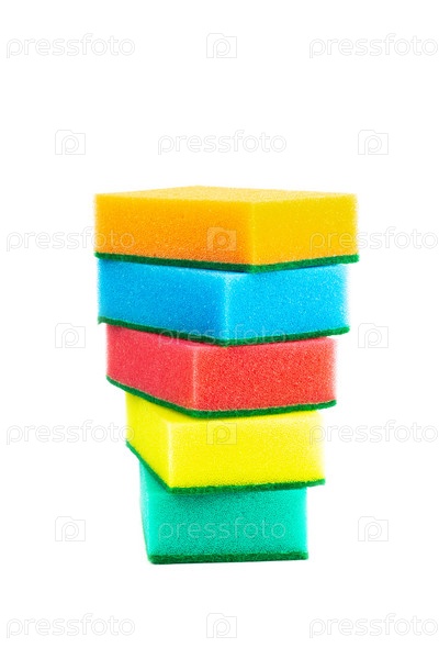 Пять губок для мытья посуды сложены, изолированные на белом фоне