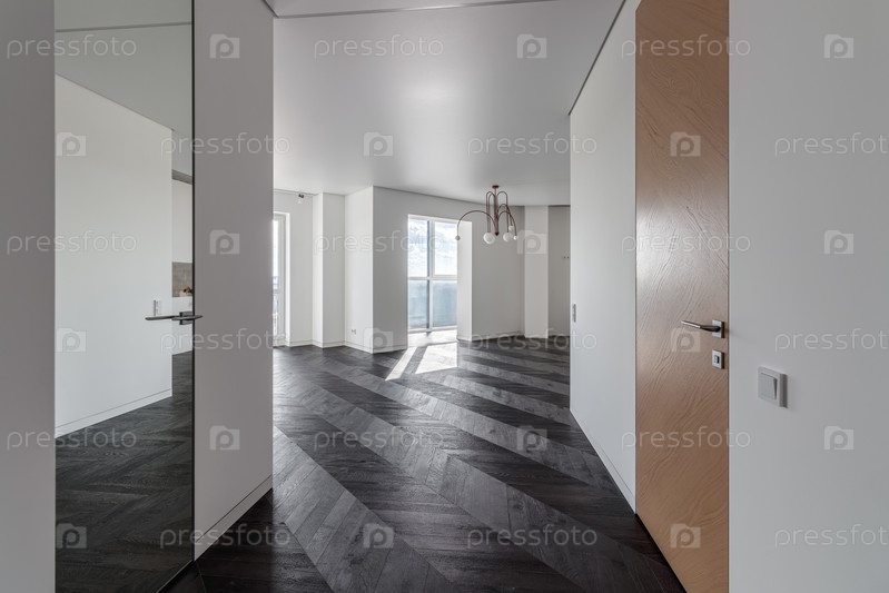 Пустая комната с темным деревянным плавающим ламинатом. Интерьер дома, просторная спальня или гостиная. Новая недавно покрашенная новая квартира или дом. Деревянный пол. Недвижимость или управление недвижимостью