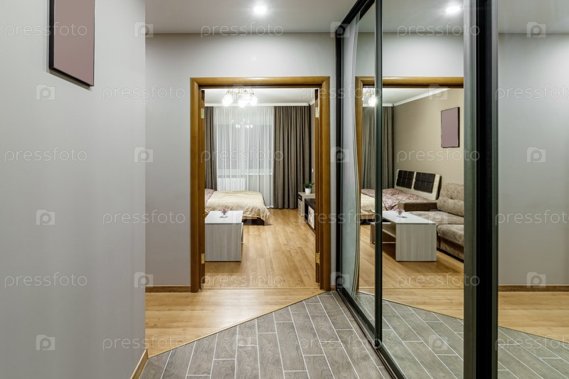 Длинный коридор в интерьере вестибюля современных квартир с дверями, шкафами, полками и зеркалом