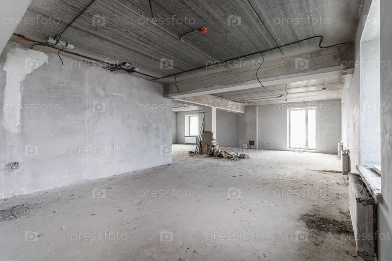 Просторные пустые комнаты на мансардном этаже после выполнения работ на стене и потолке