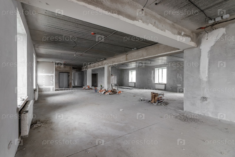 Просторные пустые комнаты на мансардном этаже после выполнения работ на стене и потолке