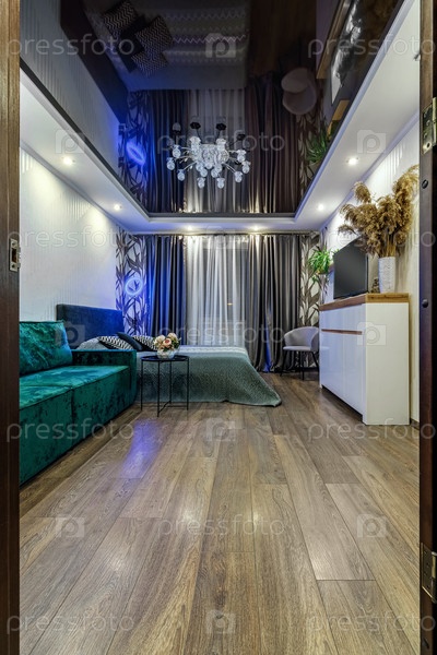 Современный интерьер комнаты с кроватью, зеленым диваном, черным глянцевым потолком