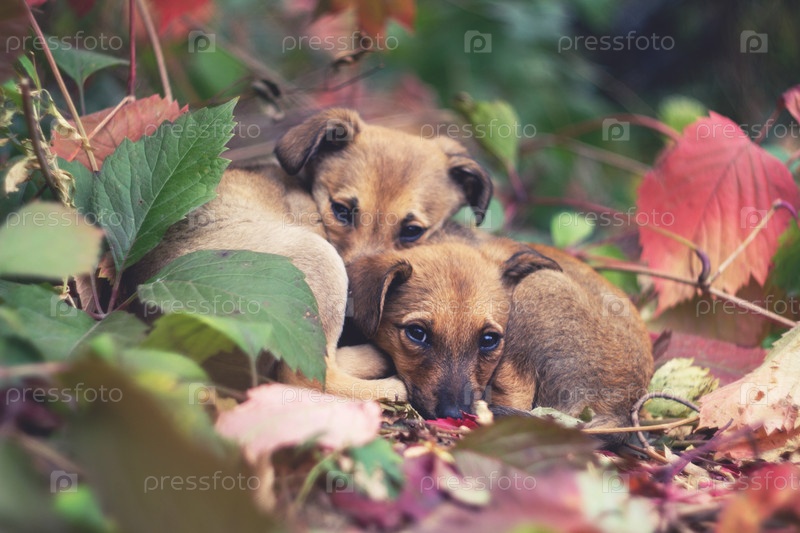 Щенки сбиваются в кучу и прячутся в осенних листьях от холода (без укрытия)
