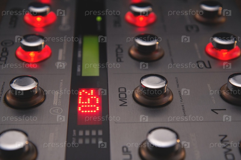 Ножной контроллер в студии звукозаписи, идет работа над музыкой: фильтр выключен, петли включены (мод, высота тона, задержка, реверберация), красный и зеленый дисплеи, красные кнопки светятся