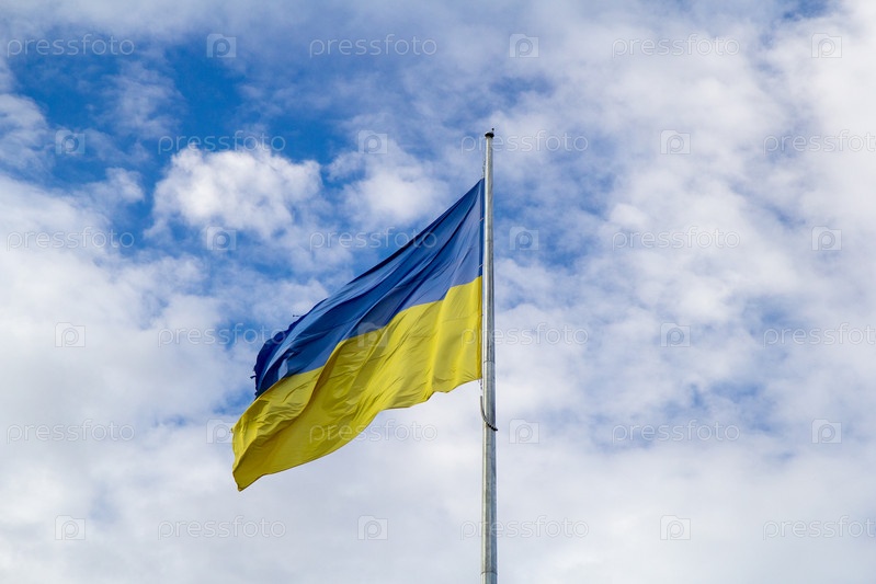 Украинский флаг на фоне голубого неба и белых облаков