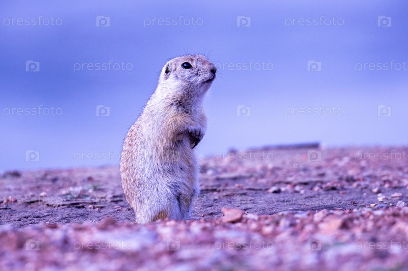 Земляная белка стоит на задних лапах на размытом синем фоне (высматривает хищника)