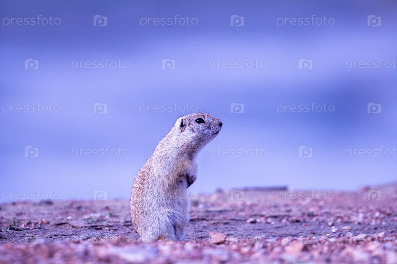 Суслик стоит, наклонившись на размытом синем фоне (высматривает хищника)
