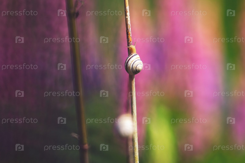 Улитка в саду на фоне розовых и сиреневых цветов (люпинов)