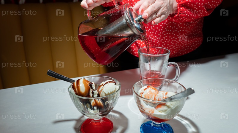 Мороженое с сиропом в стеклянной посуде на светлом столе рядом с чайным пуншем. Темный фон