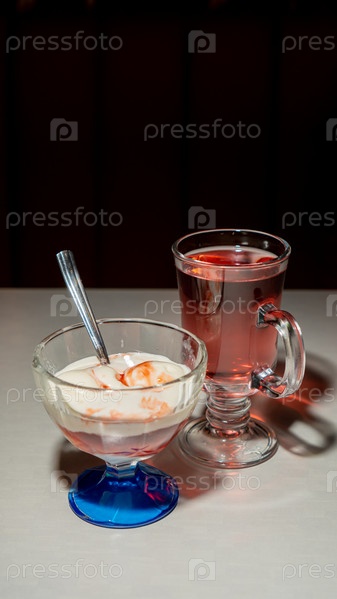 Мороженое с сиропом в стеклянной миске на светлом столе, рядом чайный пунш. Темный фон