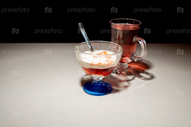 Мороженое с сиропом в стеклянной посуде на светлом столе рядом с чайным пуншем. Темный фон