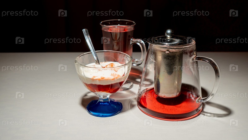 Мороженое с сиропом в стеклянной миске на светлом столе, рядом чайный пунш. Темный фон