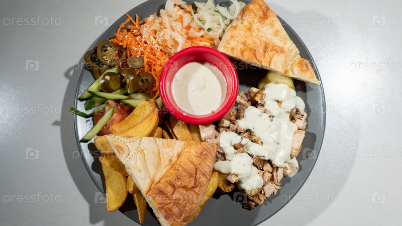 Шаурма на тарелке, курица с овощами на тарелке, донер-кебаб восточное блюдо на тарелке
