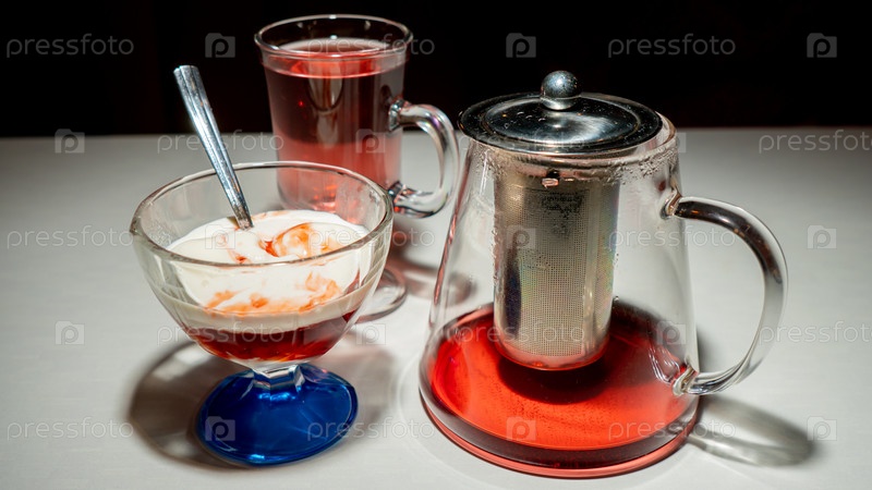 Мороженое с сиропом в стеклянной миске на светлом столе, рядом чайный пунш. Темный фон