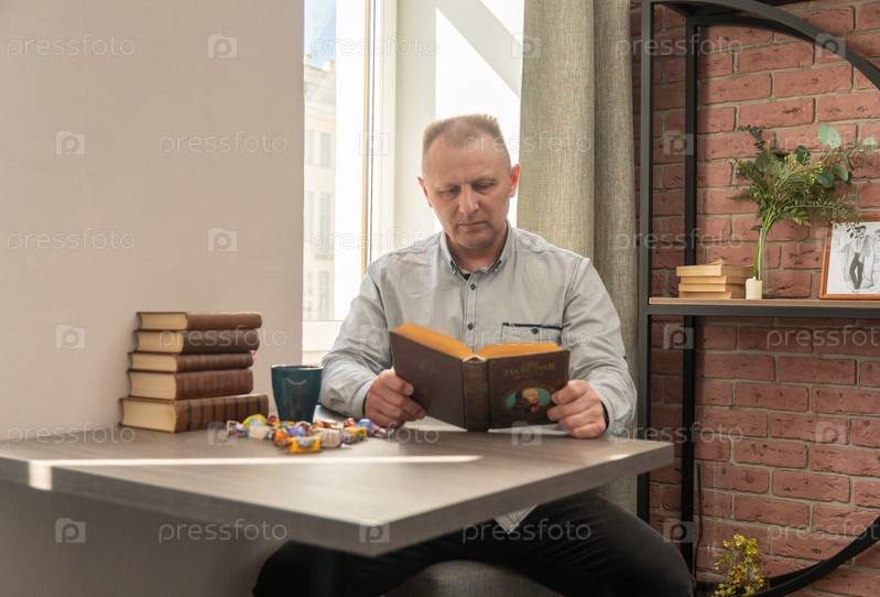 Мужчина читает интересную книгу дома