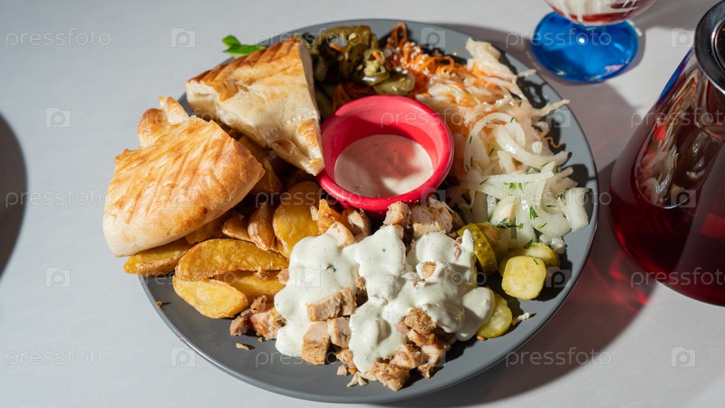 Кебаб, люля-кебаб, шаурма, блюда восточной кухни, выложенные на тарелке и украшенные зеленью и овощами, соусами и картофелем фри. Восточная кухня
