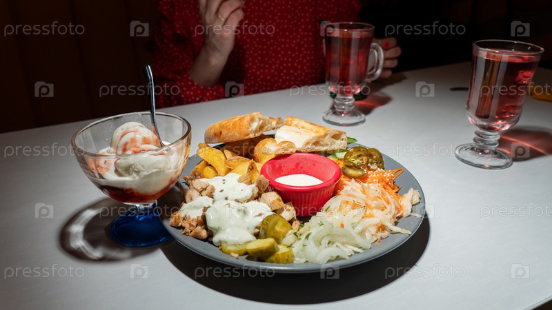 Шаурма на тарелке, курица с овощами на тарелке, донер-кебаб восточное блюдо на тарелке