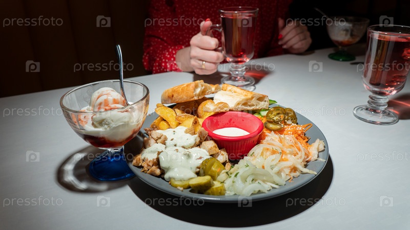 Шашлык, люля-кебаб, шаурма, блюда восточной кухни, выложенные на тарелке и украшенные зеленью и овощами, соусами и картофелем фри. Восточная кухня