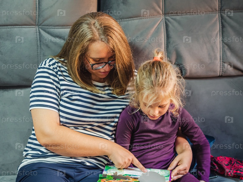 Мать и дочь вместе читают книгу, сидя дома на сером диване. Концепция счастливой семьи