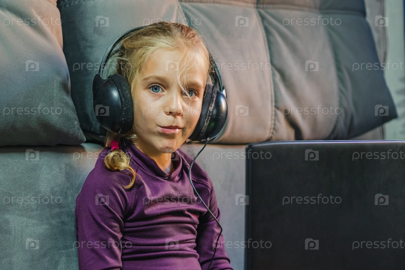 Блондинка с большими наушниками на голове сидит с ноутбуком на сером диване. Взгляд ребенка направлен на камеру. Концепция дистанционного обучения