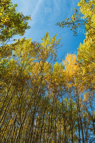 Тонкие стволы деревьев с желтой листвой на вершине на фоне голубого неба