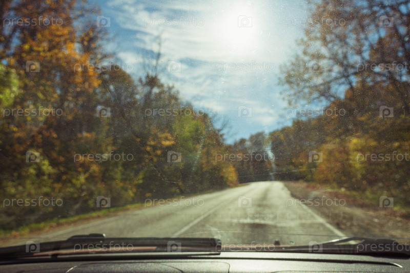 Проселочная дорога посреди осеннего леса. На заднем фоне голубое небо. Вид из салона автомобиля. Сосредоточьтесь на пыльном стекле