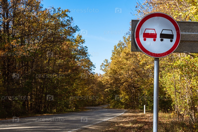 Знак запрета обгона на фоне проселочной дороги и осеннего леса. Концепция безопасности дорожного движения